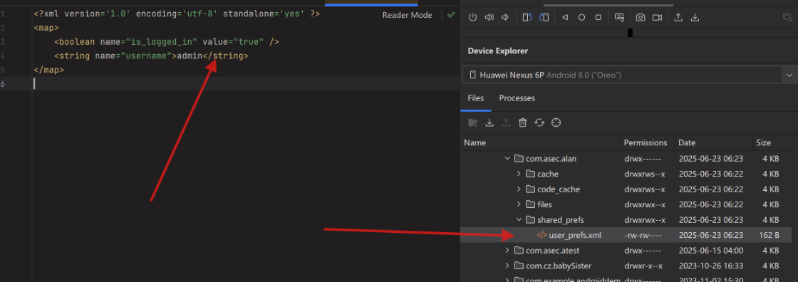 基于上述代码逻辑的分析,接下来通过drozer命令进行利用测试,如果已经登录过APP,则在该程序目录会生成user_prefs.xml文件,里面会写入"is_logged_in"的值为true