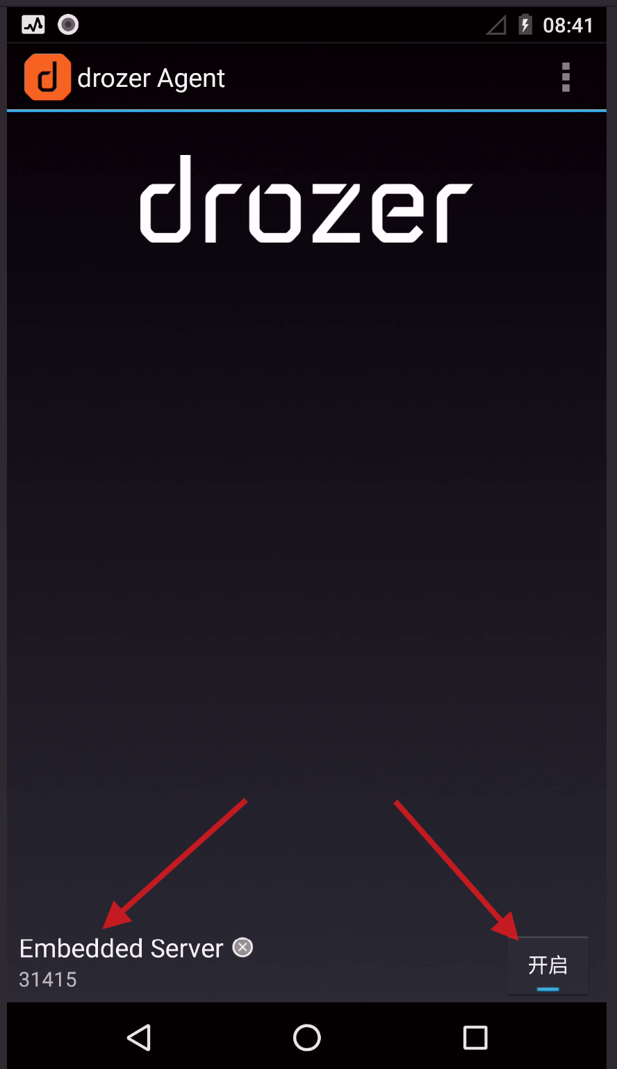 具体droze的下载和安装不详细介绍,可以自行百度,安装完成后先在android端运行drozer agent,点击开启。