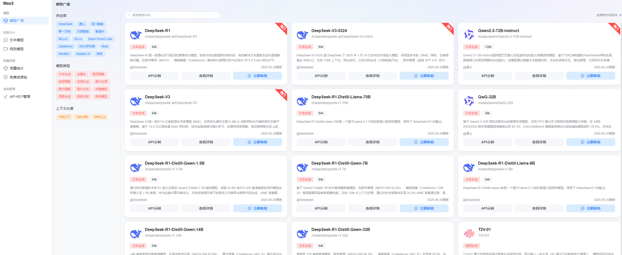 MaaS 平台即 “模型即服务”(Model as aService)平台,是一种依托云计算的人工智能服务模式。模型即服务(MaaS)平台面向企业开发者、创业者及非技术背景用户,提供开箱即用的热门AI模型服务,支持零代码体验、API快速集成与灵活计费,降低AI应用开发门槛,加速业务创新。允许用户通过API接口或其他方式访问和使用预先训练好的机器学习模型,无需自己从头开始训练模型,使得即使没有深厚机器学习背景的用户也能享受到高水平的AI技术支持。(引用蓝耘官方介绍)