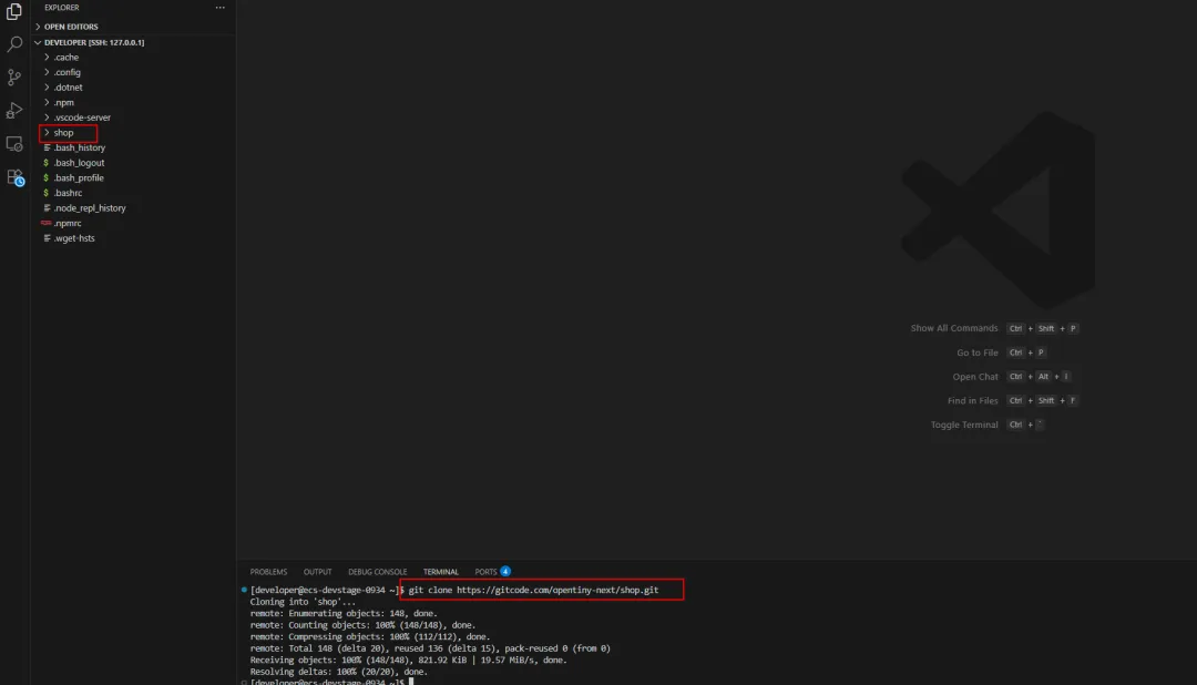 打开 VSCode 代码编辑器,"Ctrl +`" 打开终端命令行工具,使用 git clone 命令克隆电商项目代码。
