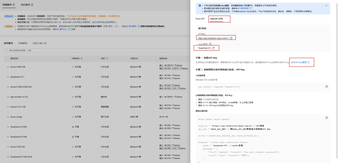 (1)开通商用 DeepSeek-V3-64K 服务 华为云 MaaS 提供了商用按 token 计费模型和单模型 200 万免费 Tokens。 点击领取 DeepSeek-R1/V3-64K 百万 tokens 代金券