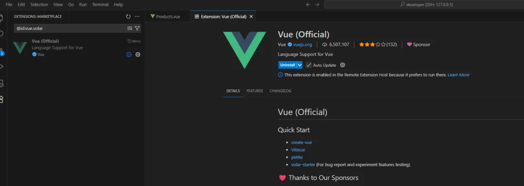 注:打开 Products.vue 文件时,若右下角提醒安装 Vue (Official) 插件,直接点击安装即可。