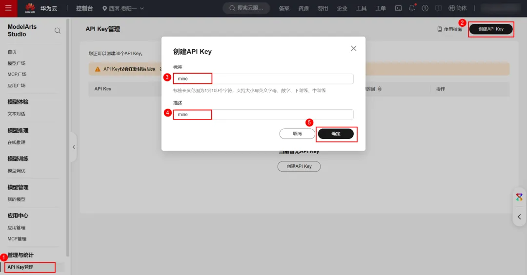 点击 API Key 管理 -> 创建 API Key,自定义标签和描述,点击确定创建 API Key。(注意保存好 API Key)。
