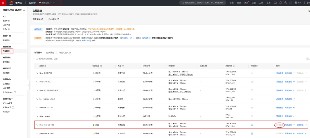进入 ModelArts Studio 控制台首页,区域选择【西南 - 贵阳一】,在左侧菜单栏,选择【在线推理】 > 【预置服务】 > 【商用服务】,选择【DeepSeek-V3-64K 模型】,点击【开通服务】。