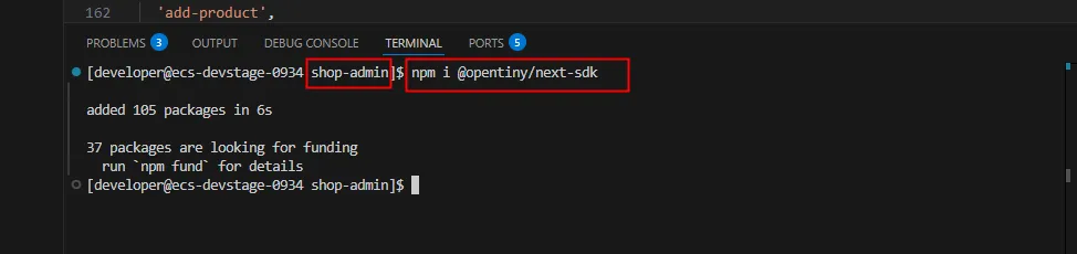 (1)进入到 shop-admin 目录下(可以重新打开一个终端,或者在原 shop-admin 终端直接操作),安装 NEXT SDK。