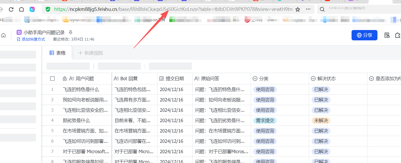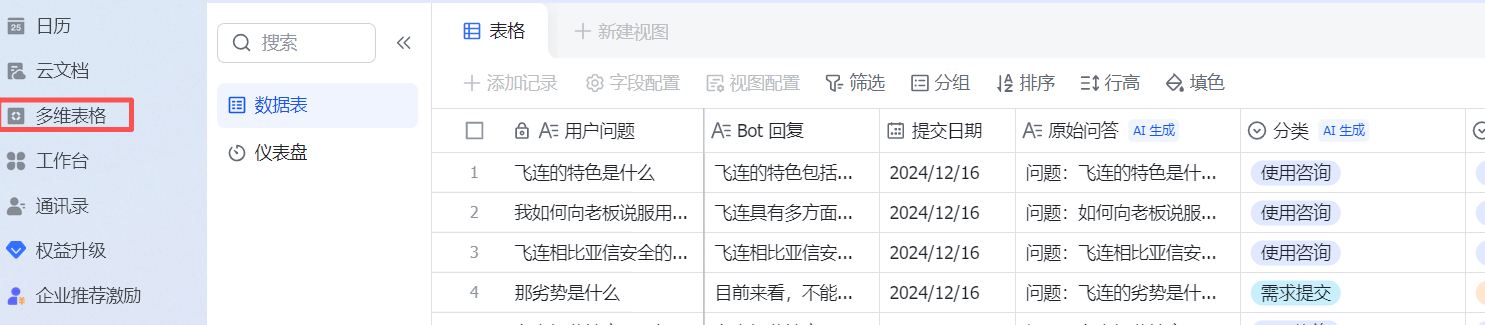 在使用Coze做智能助手时,每次AI与用户沟通后,用户的问题对于我们是一个黑盒。为了能够收集用户的使用信息,以及了解AI回答是否准确。这里尝试通过调用飞书多维表格API,把用户和AI的沟通内容收集并上传到飞书多为表格中。便于后续对相关内容进行分析,优化AI助手。