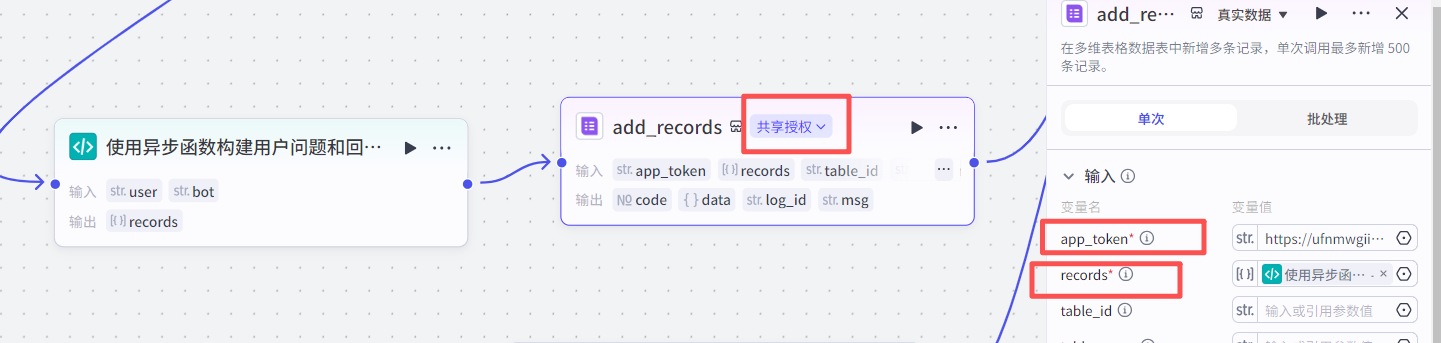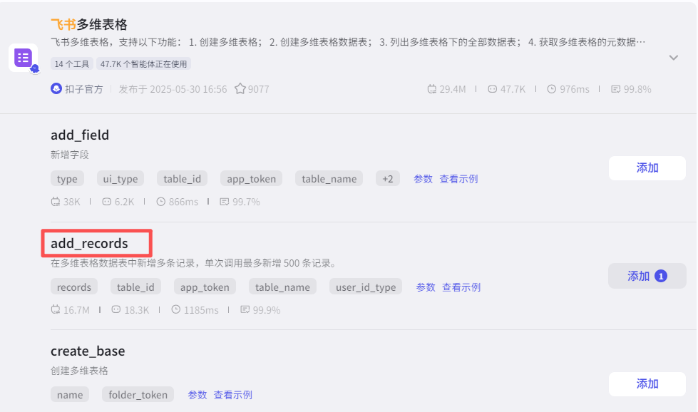 添加插件,选择"add_records",用于添加记录数,具体内容可以查看飞书表格中的Api,主要是通过Api请求完成。