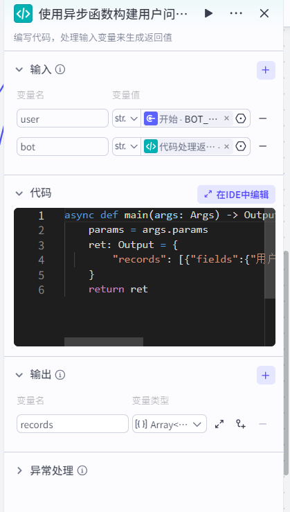在Coze工作流中,编写代码来构建符合"飞书多维表格"的结果。“records”中的内容可以根据自己的飞书表格字段进行调整。