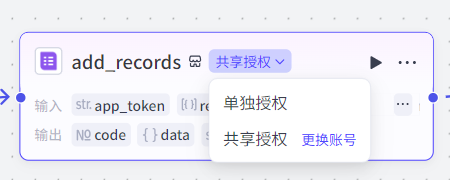 创建一个 OAuth 插件节点后,OAuth 插件默认为 单独授权模式,如需改为 共享授权模式,可以单击 未授权,选择 共享授权,并根据页面提示完成授权。后续 OAuth 插件节点每次运行时自动使用开发者预设的密钥,无需用户授权。