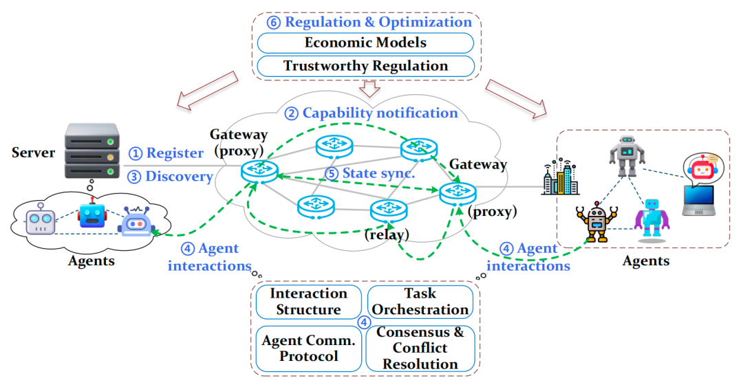 要实现上述特性,IoA依赖六大核心技术模块,从“找到合适伙伴”(能力发现),到“高效分工合作”(交互与任务编排),再到“顺畅沟通”(通信协议)、“解决矛盾”(共识机制)、“持续合作动力”(经济模型)和“安全可信保障”(监管技术)。这六大模块环环相扣,共同构成IoA的协作引擎。