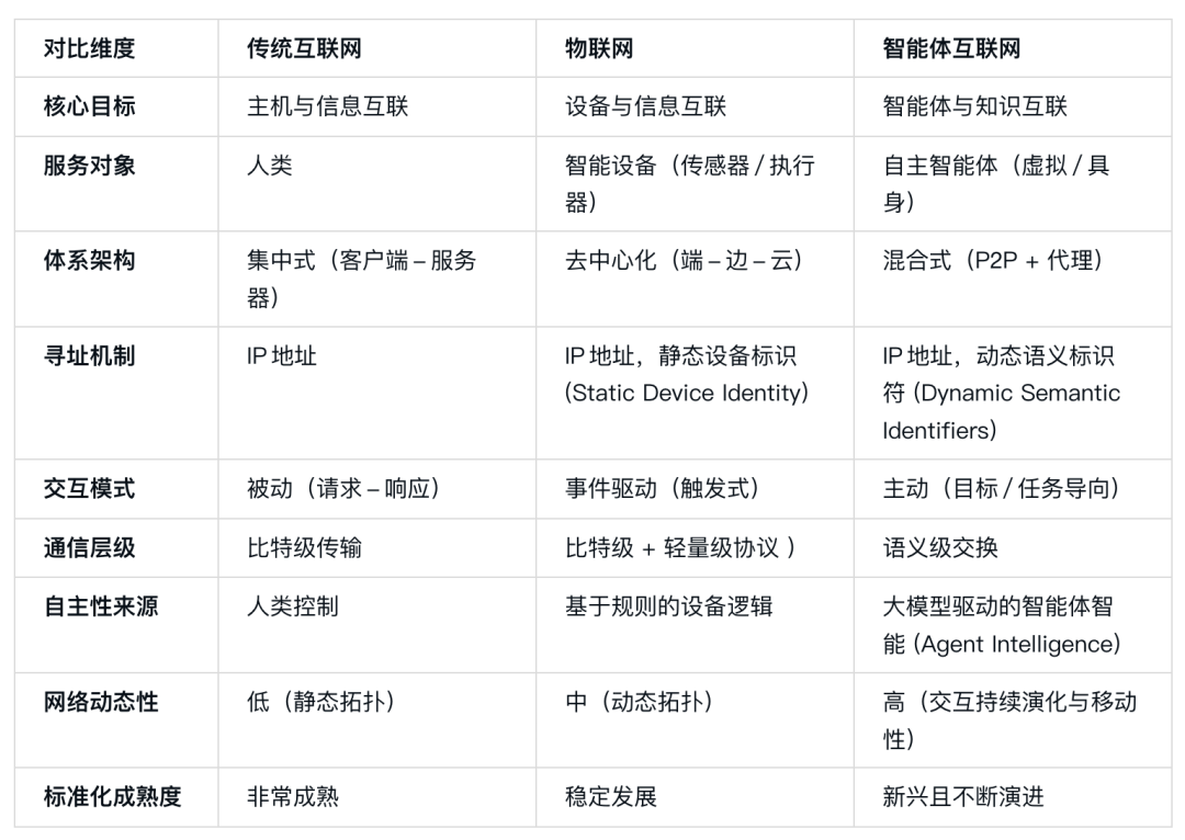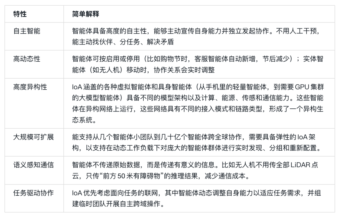 智能体互联网和传统互联网、IoT的核心差异,体现在6个关键特性上,这些特性让智能体真正实现自主协作: