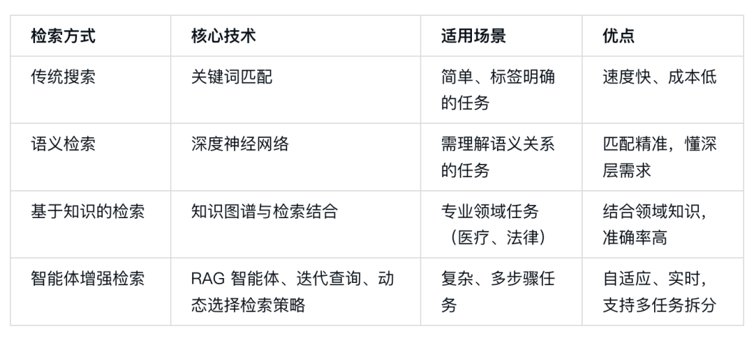 能力检索:按任务需求找匹配的智能体。检索方式分为四类:传统搜索、语义检索、基于知识的检索和智能体增强检索(Agentic RAG)。