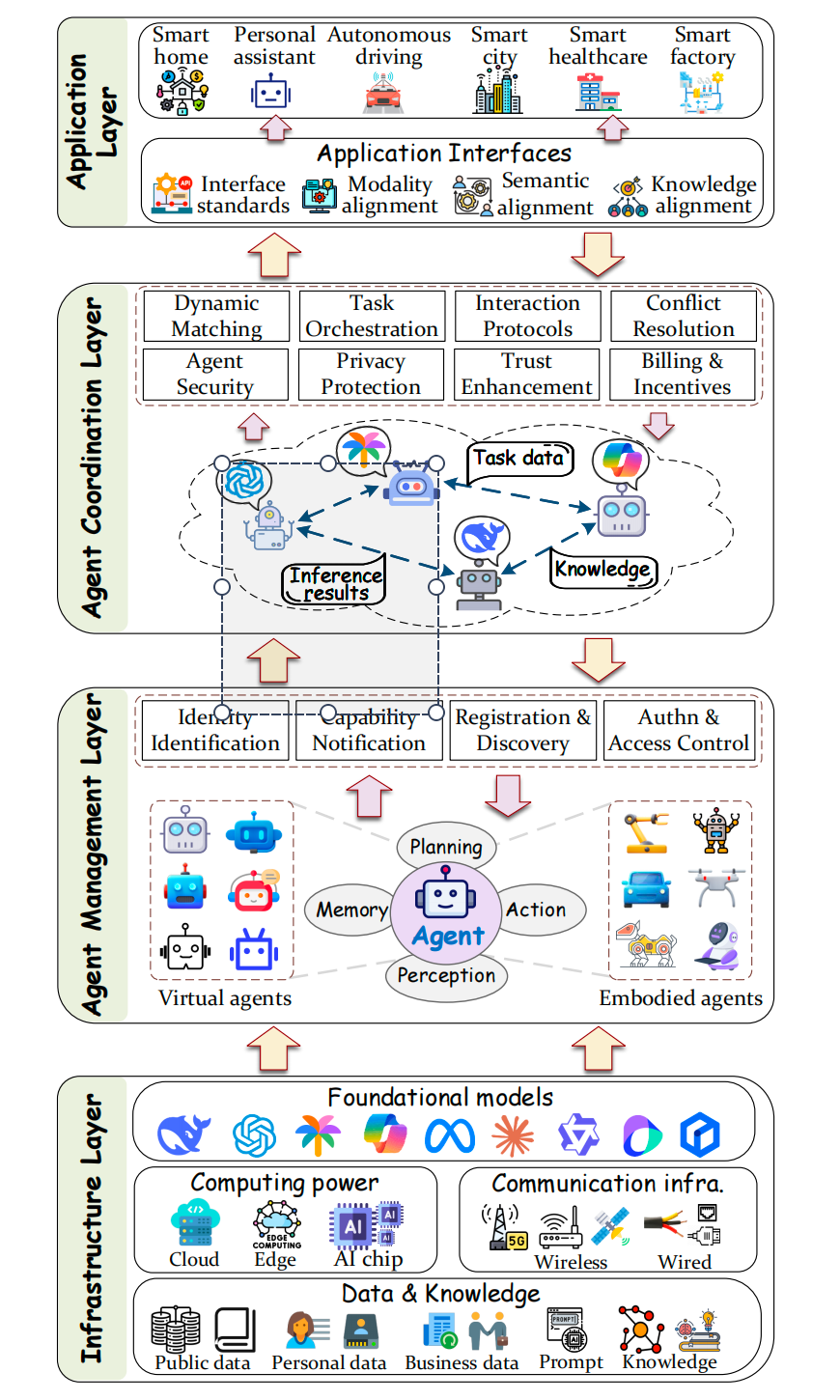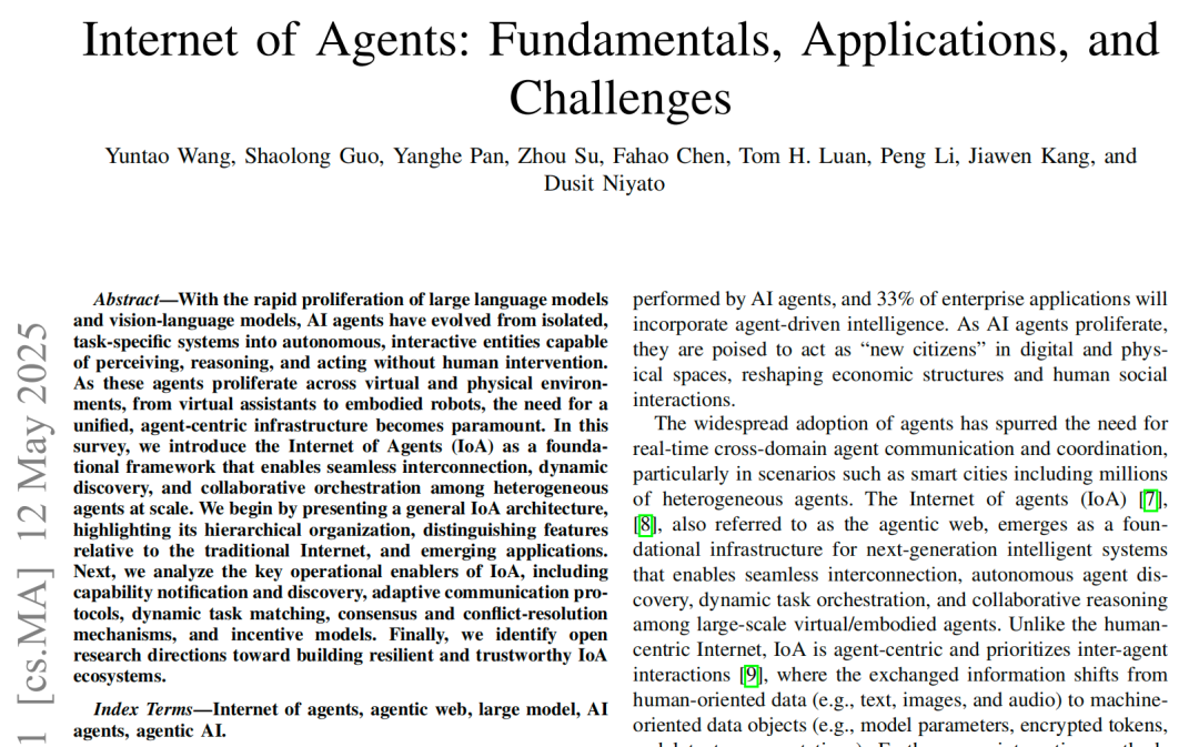 论文提出了智能体互联网(Internet of Agents, IoA)的概念,它是一套以智能体为中心的底层架构,核心目标是让海量、不同类型的智能体(虚拟的、实体的)能无缝连接、自主发现伙伴、协同完成任务,就像为智能体打造了一个专属互联网。