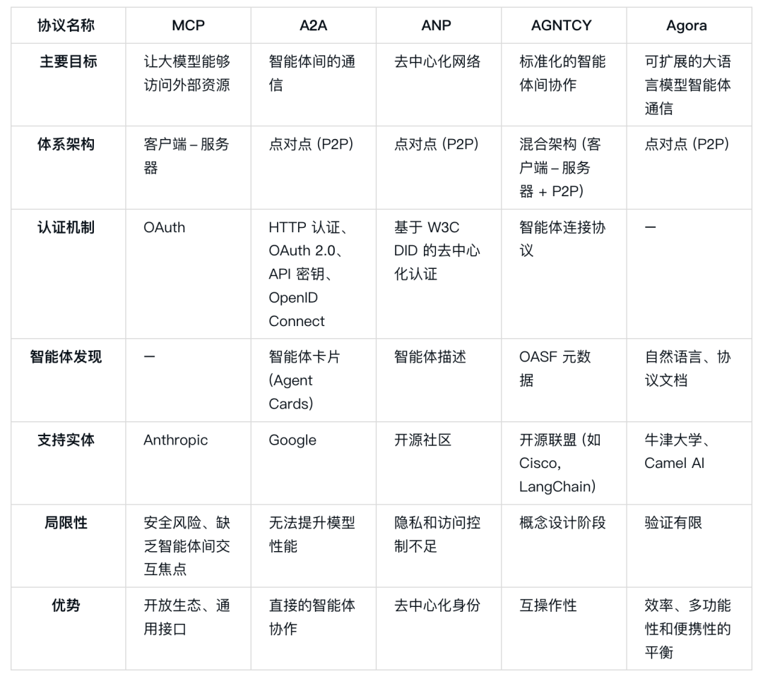 - 通信协议:智能体间的通用语言,比如Google的A2A协议(智能体对智能体直接通信)、Anthropic的MCP协议(智能体调用外部工具,如查天气API),确保不同厂商的智能体能对话。
