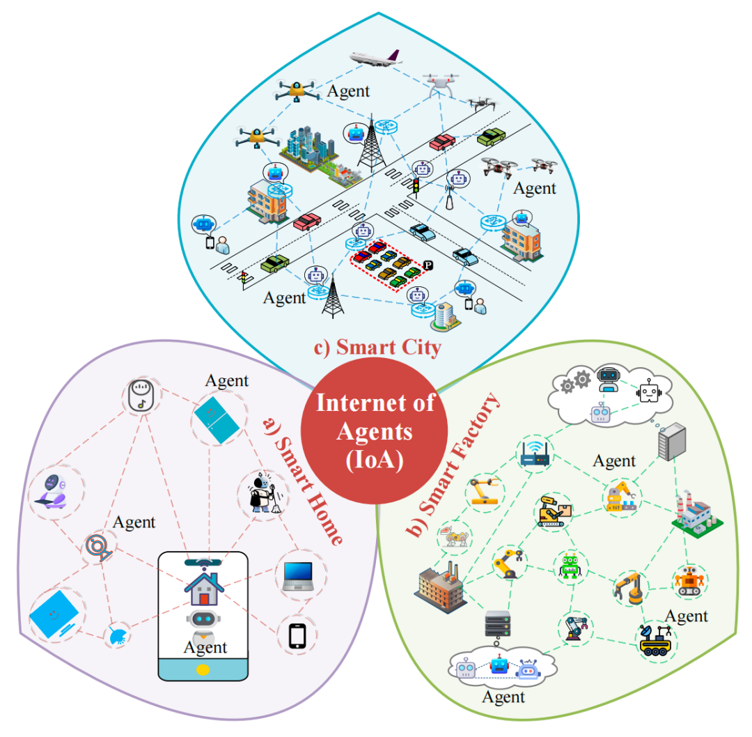 但问题也随之而来,当数百万个不同类型的智能体(比如智能城市里的交通监控智能体、物流无人机、家用机器人)需要协同工作时,传统互联网和物联网(IoT)根本管不过来——传统互联网以人为中心,传递的是文本、图片等人类能理解的数据;IoT虽连接设备,但仅能实现简单的监控和控制,无法支持智能体间复杂的自主协作。