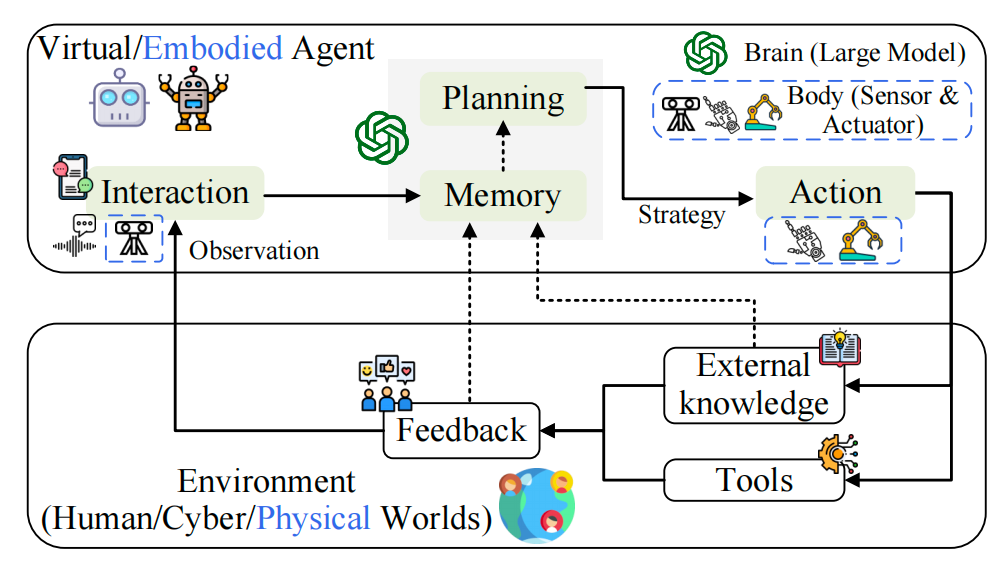 随着大型语言模型(LLMs)和视觉语言模型(VLMs)的快速发展,AI智能体已从单一任务工具进化为能自主感知、推理和行动的数字实体——小到手机里的虚拟助手,大到工厂里的人形机器人,都属于这类智能体。