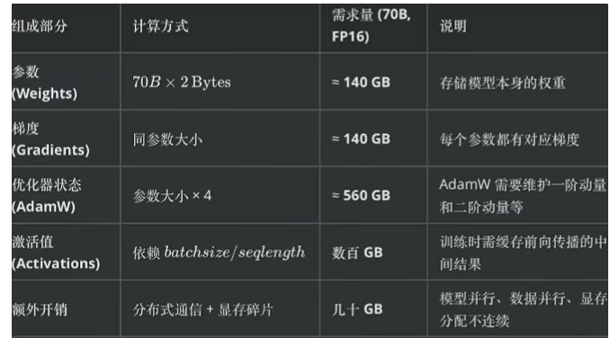 训练过程中梯度存储的显存与存储显存相同占用140G,优化器例如AdamW要为每个参数额外维护一阶动量和二阶动量等额外信息一般占用4倍显存,也就是约560G, 全量微调总共需要840G,再考虑激活值存储、显存碎片化以及分布式训练的冗余开销,实际需求往往在1TB显存左右。