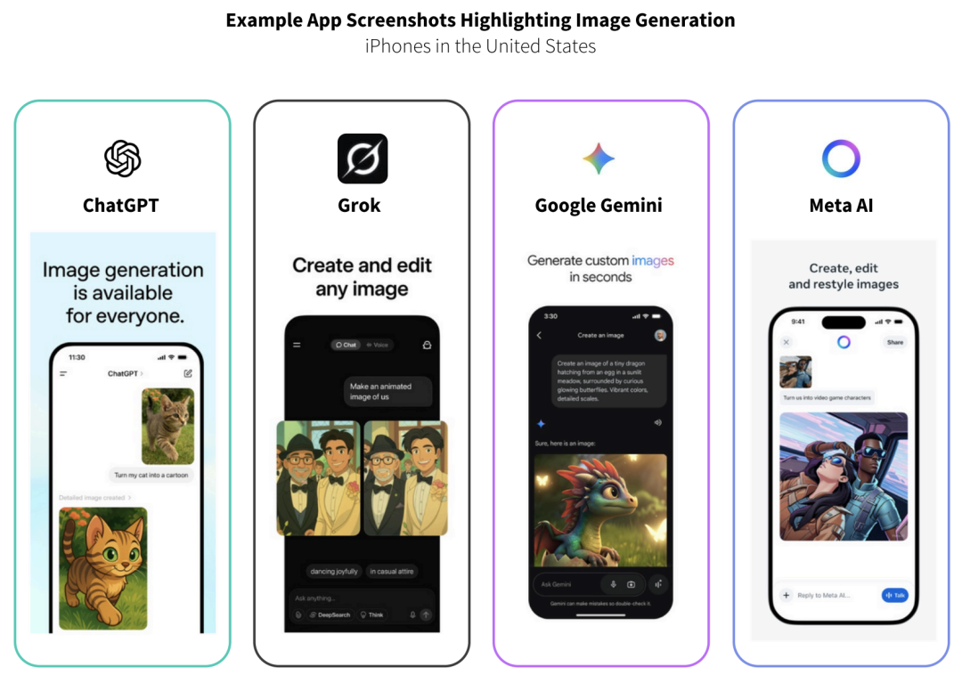 图像生成功能成为当前最重要的获客焦点。ChatGPT、Gemini 等头部应用不仅在应用商店截图中大力推广其图像生成和语音模式功能,还积极竞标“ai image”等相关关键词,并取得了显著效果,来自此类搜索的下载量持续增长。