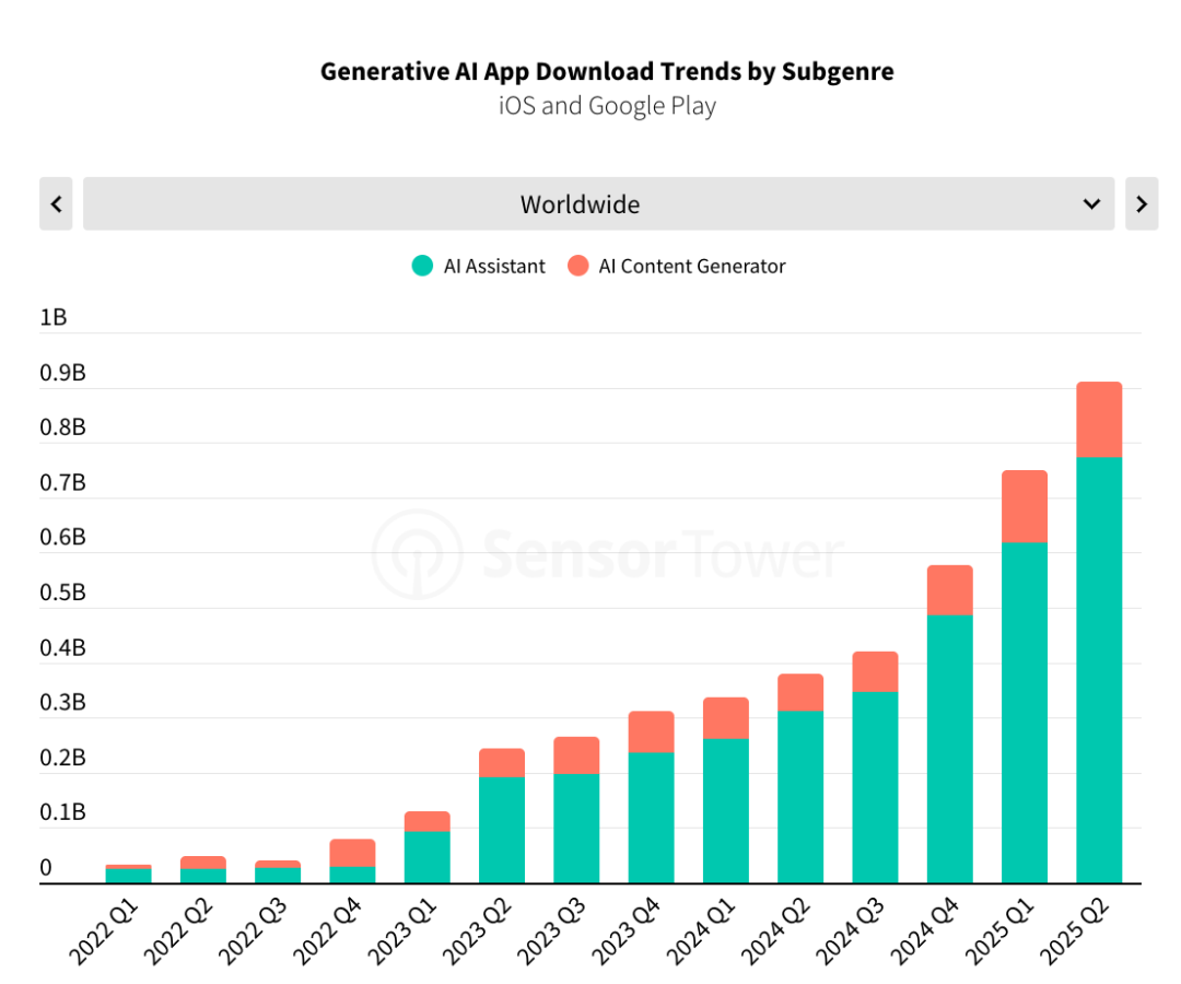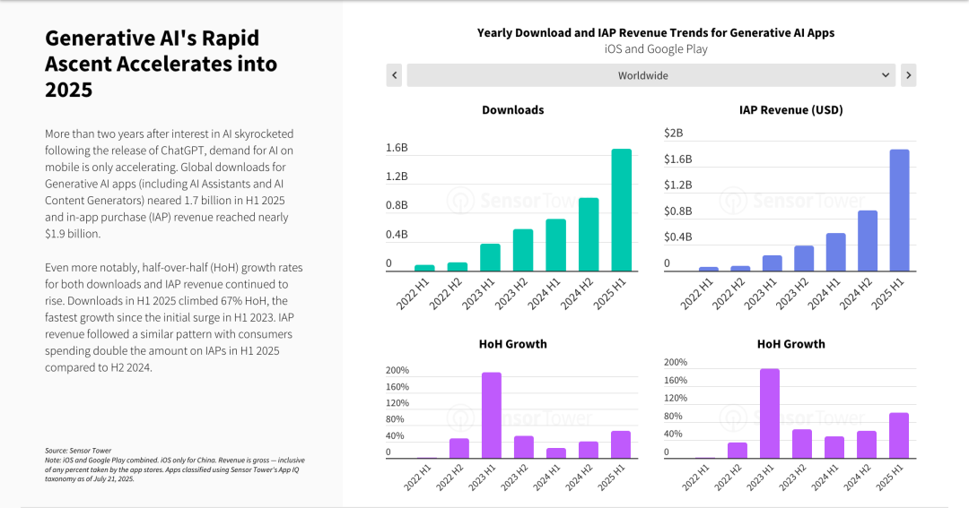 生成式AI应用的市场规模正在急剧扩张。2025年上半年,全球生成式AI应用的下载量接近17亿次,应用内购买(IAP)收入更是达到惊人的19亿美元。