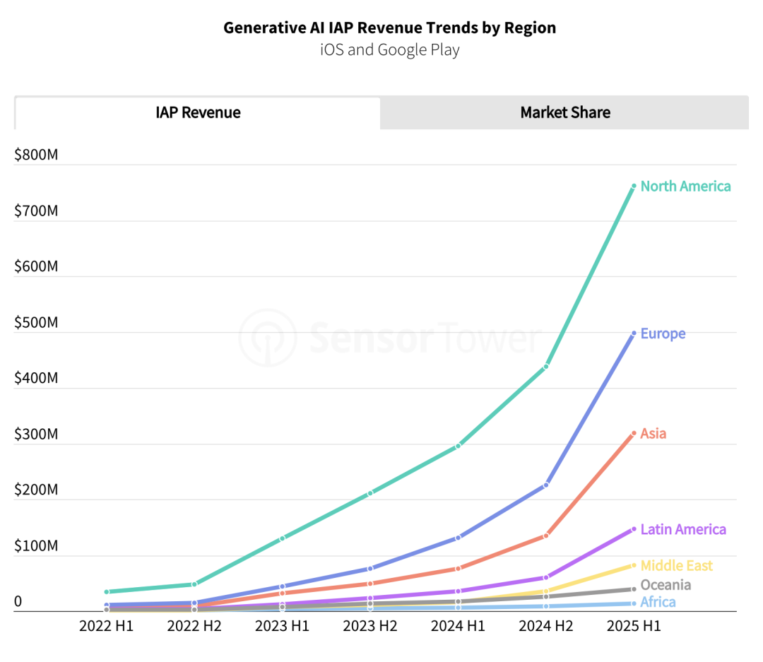 在收入方面,北美地区(主要是美国)以7.62亿美元的 IAP 收入(环比增长74%)位居榜首。但其他地区的增长势头更猛,拉丁美洲(+147%)、亚洲(+136%)、中东(+131%)和欧洲(+121%)的收入均实现翻倍增长。
