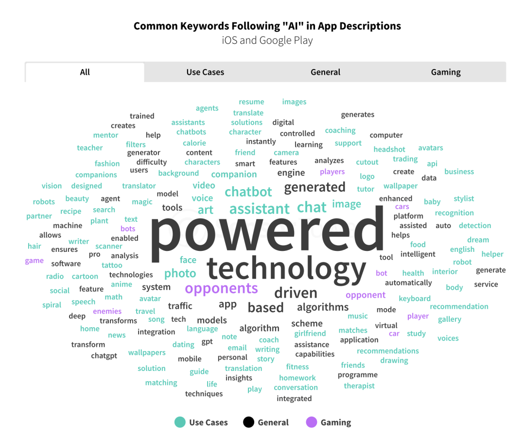 AI 的影响力已远超独立的聊天机器人应用。“AI”一词在 iOS 和 Google Play 的应用描述中出现了超过10万次。