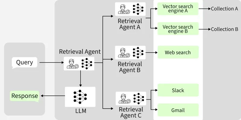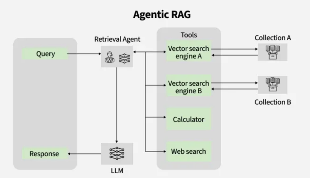 - 数据源/工具选择:根据查询内容和所需信息类型,智能体选择合适的数据源或工具来获取信息。例如,选择使用向量数据库检索相关文档,还是调用某个API获取实时数据。