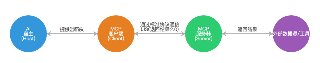 在上述架构中,Host 是发起请求的一方,它通过 Client 向各个 Server 发出MCP 请求;Server 接收到请求后执行相应操作(如查询数据库、调用工具等),并将结果通过 Client 回传给 Host。Host 再将这些结果整合到 AI 模型的上下文中,供模型生成回答或进行下一步决策。整个过程对 AI 模型来说是透明的,模型只需通过统一的 MCP 接口获取所需的信息或执行操作,而无需关心具体是哪个 Server 提供的以及如何实现的。