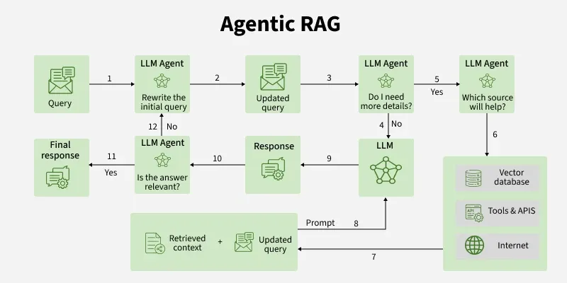 上述流程体现了 Agentic RAG 的自主闭环特性:智能体在"感知-决策-行动-反馈"的循环中不断迭代,直到产生令用户满意的结果。这种架构使系统能够应对复杂多变的查询,在需要时进行多轮交互和工具使用,从而显著提升回答的深度和准确性。