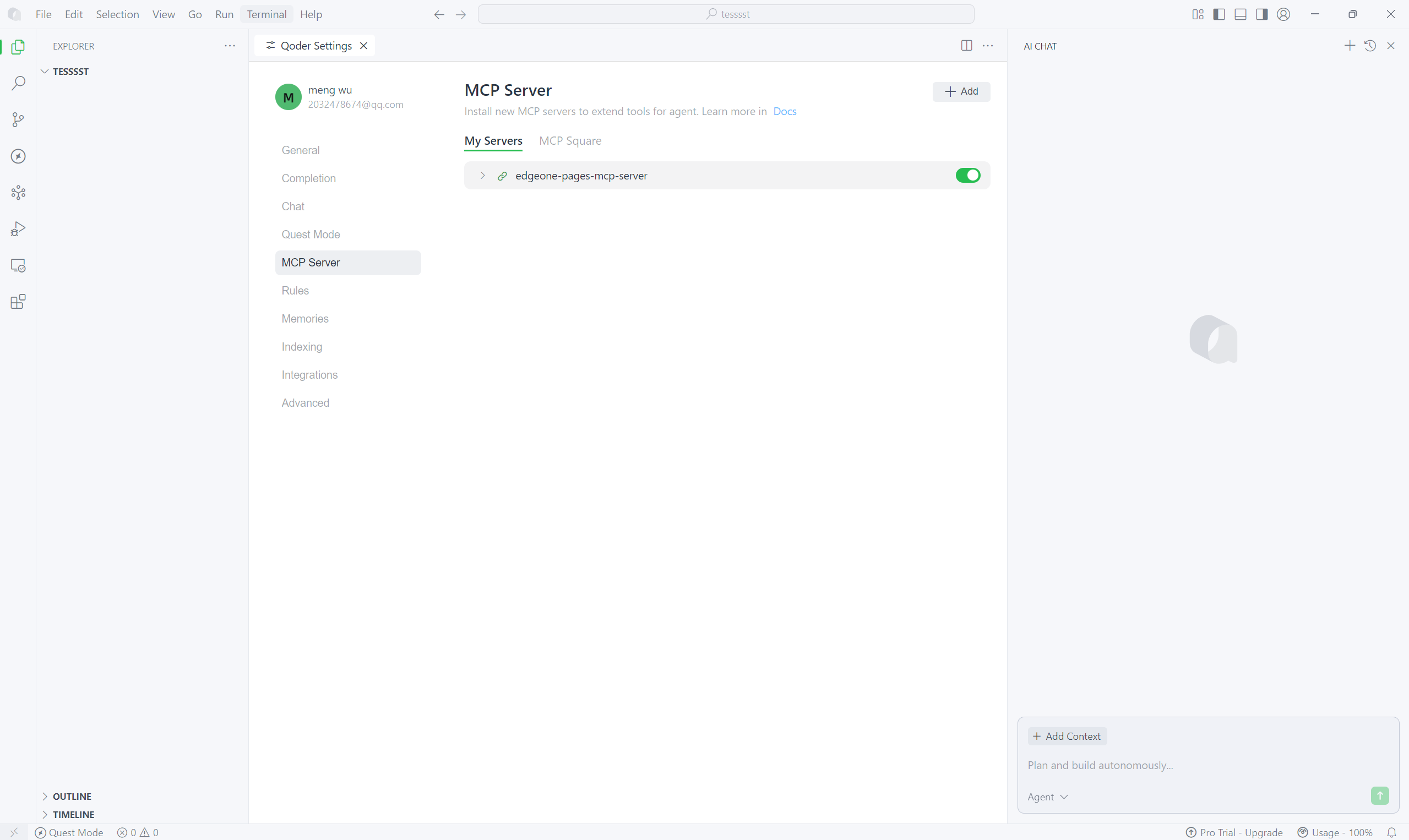 如果你不满足,你会发现这个网址没有办法改为你想要的名字,而且打开后都有豆包创作的提示框,那么进阶版来了,这才是计算机学生该会的。那么今天就利用edgeone pages mcp和Qwen3-Coder模型实现。我用的IDE是Qoder,当然别的AI编辑器也是可以的,都可以配置mcp,通常在“设置”里,
