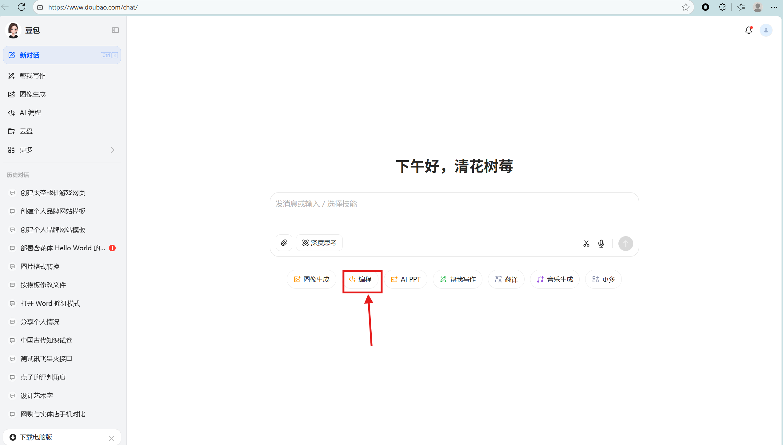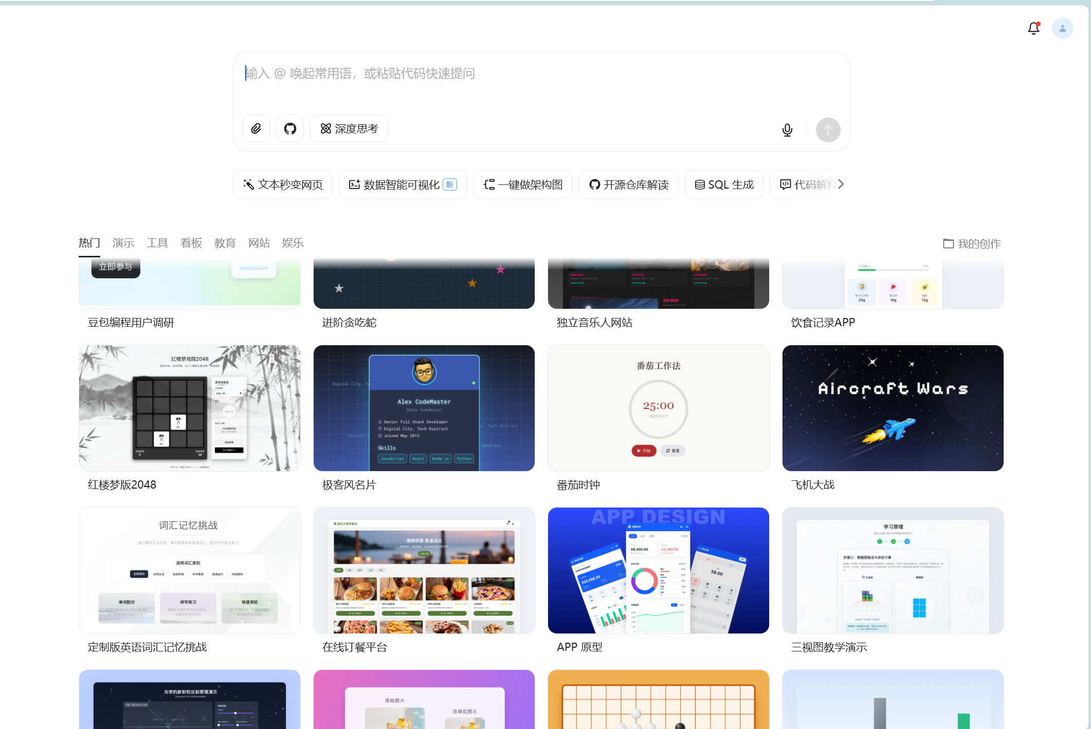 没错就是豆包,我们打开以后点击这个“编程”这里面有非常多的模板和功能,而且可以自己加以创作。我随便试了一个