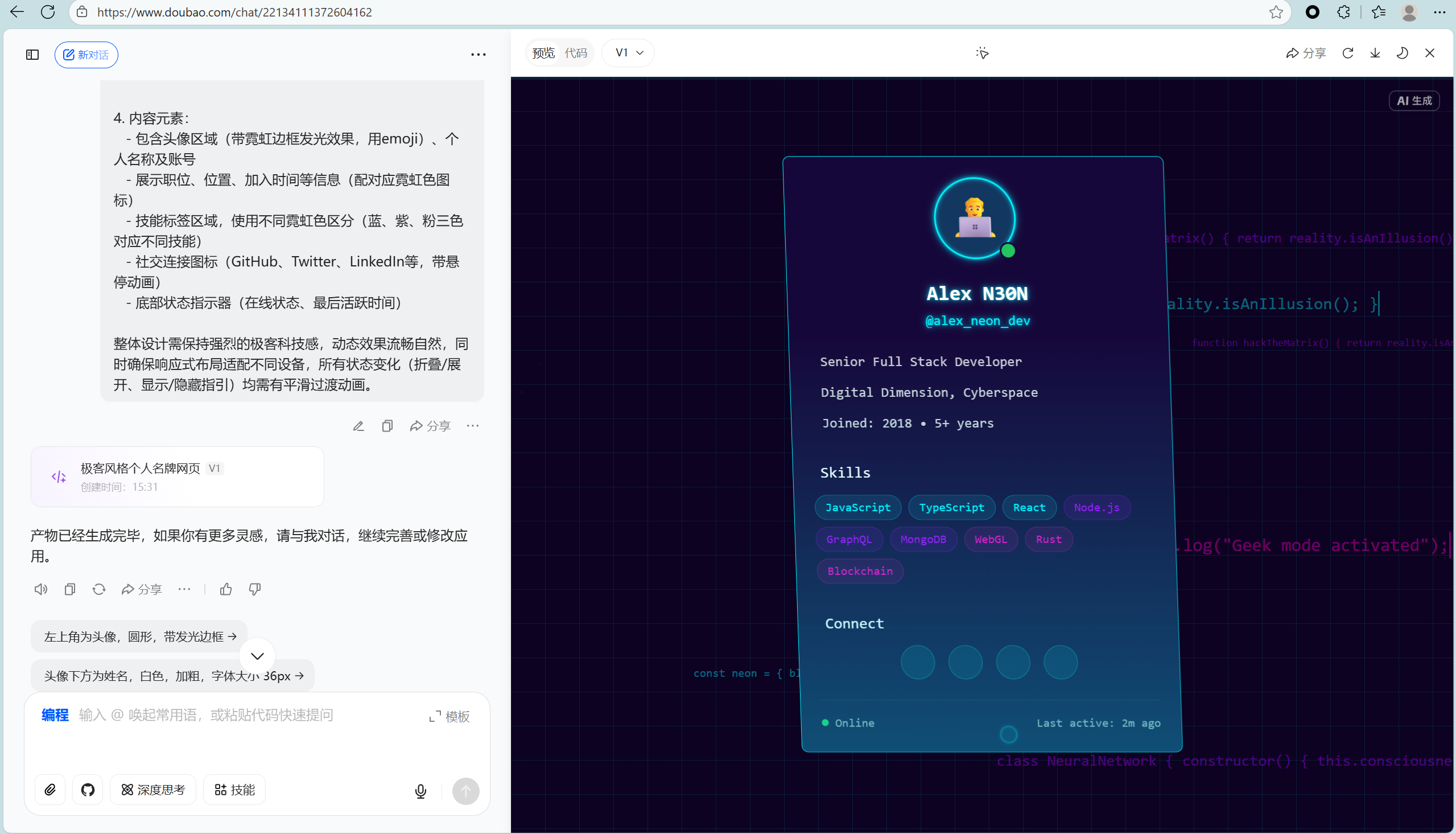 效果其实很好了风格酷炫,不过它是模板,确实应该被精修过,而且你可以点击右上角的分享按钮分享给他人,https://www.doubao.com/share/code/a12e5b870de81f89 ,简易版到这里就结束了。