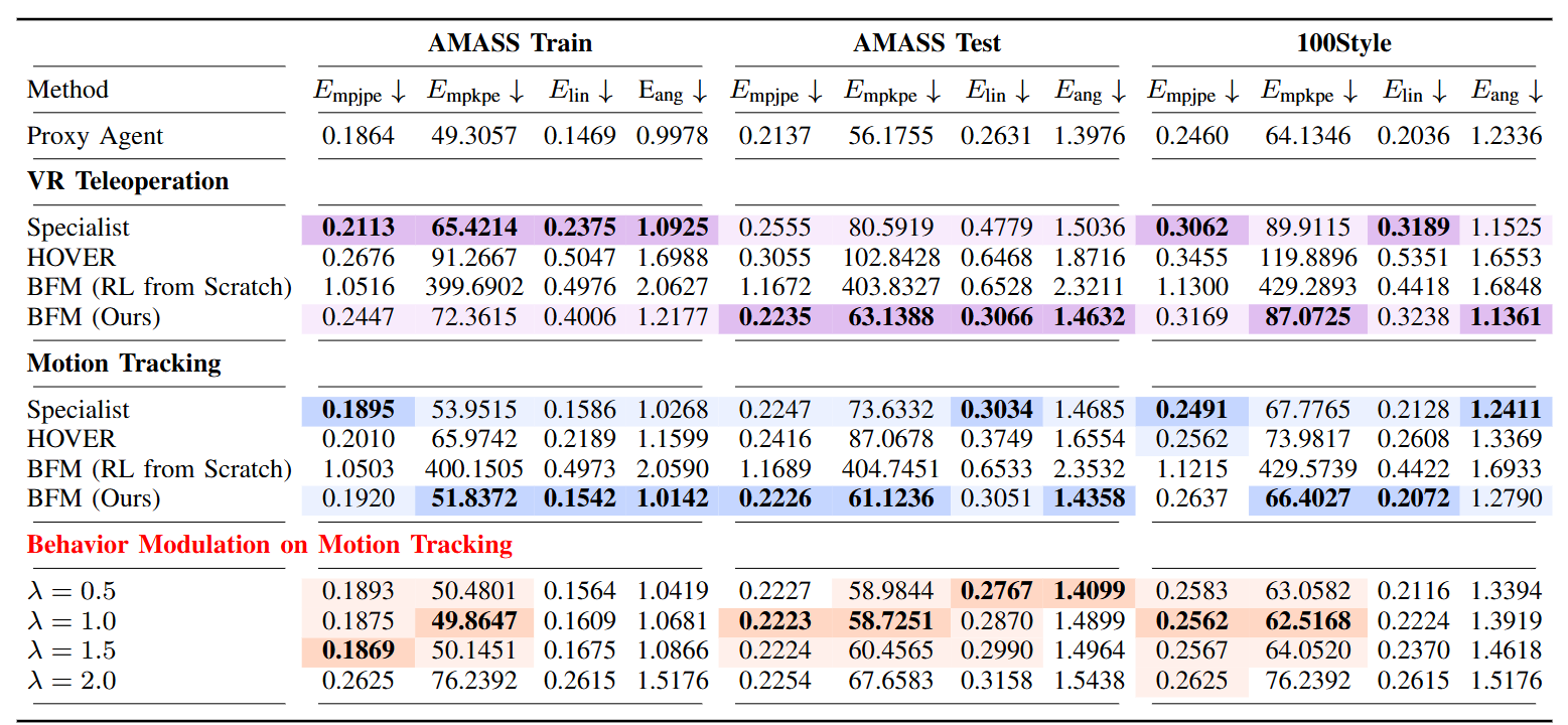 图4|在 VR 远程操作和动作跟踪任务中对 BFM 与基线方法的仿真评估。最优结果以加粗形式显示并用深色背景标记,次优结果则用浅色背景标记。在动作跟踪任务的行为调节实验中,相较于 BFM 提升幅度最大的结果以加粗并深色背景标记,存在提升但并非最优的结果则以浅色背景标记