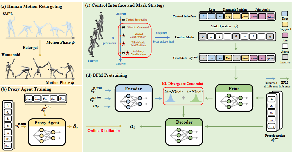 图2|BFM 的实现概览。(a) 将人体动作数据集重定向到人形机器人,用于Agent训练。(b) Agent通过动作模仿进行训练,并在仿真器中获取完整信息。(c) 同一个行为可以通过多种控制模式来指定,从抽象的文本指令到具体的全身关节位置,均可形成不同的目标状态。作者将不同控制模式的激活简化为对统一控制接口施加掩码。该接口仅涵盖根部控制、关键部位位置以及关节角度,突出了本文聚焦于低层次人形控制的目标。(d) 使用 CVAE 对 BFM 进行建模,并结合 DAgger 框架完成预训练,从而在结构化潜在空间中编码丰富的行为知识
