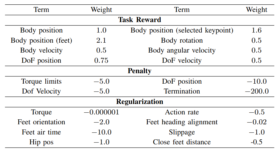 ● 奖励函数:由三部分组成,包括模仿任务奖励、正则化项和惩罚项。任务奖励衡量动作与参考动作的一致性;正则化用于约束控制信号;惩罚项则避免过大力矩或姿态失衡。