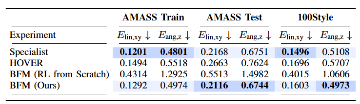 图5|在三个数据集上的运动任务中,对 BFM 与基线方法的仿真评估。最优结果以加粗形式显示并用深色背景标记,次优结果则用浅色背景标记