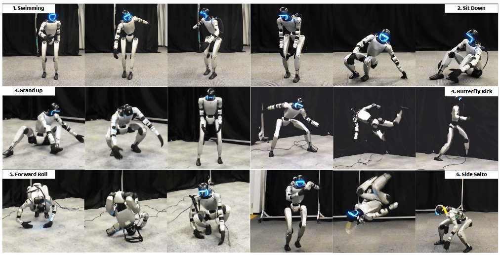 图1|行为基础模型(BFM)使人形机器人能够以零样本的方式完成多种动作,包括 (1) 游泳姿势、(2) 坐到地面、(3) 从地面站起、(4) 蝴蝶踢。同时,它还能高效习得新的动作,例如 (5) 前滚翻 和 (6) 侧空翻