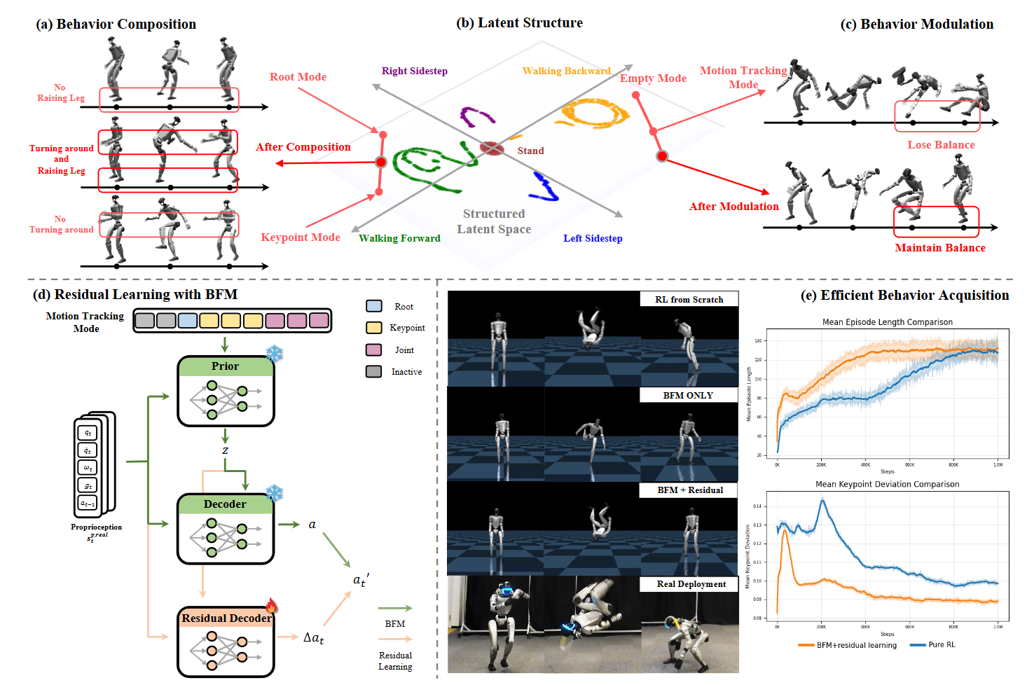 图6|综合实验结果:(a) BFM 通过对来自两种不同控制模式的潜在变量进行线性插值,实现新行为的组合。(b) T-SNE 可视化结果(棕色表示站立,绿色表示前进,黄色表示后退,蓝色表示左侧步,紫色表示右侧步)表明 BFM 提供了具有清晰方向性和对称性的结构化潜在空间。(c) BFM 可以通过在潜在空间中的线性外推实现行为调节,使生成的行为更好地符合期望的控制模式。(d) 在预训练的 BFM 基础上采用残差学习,以高效获取新的行为。(e) 选取侧空翻作为具有挑战性的案例,将所提方法与从零训练强化学习策略的方法进行对比