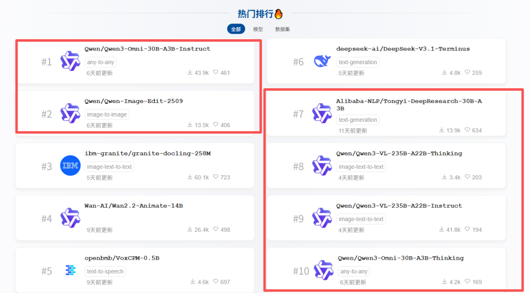 阿里通义千问这周真的是杀疯了,开源了很多模型,学不过来了,抱抱脸热榜都要被Qwen承包了,涉及:Qwen3-Omni、Qwen-Image-Edit、Qwen3-VL以及上周的DeepResearch。