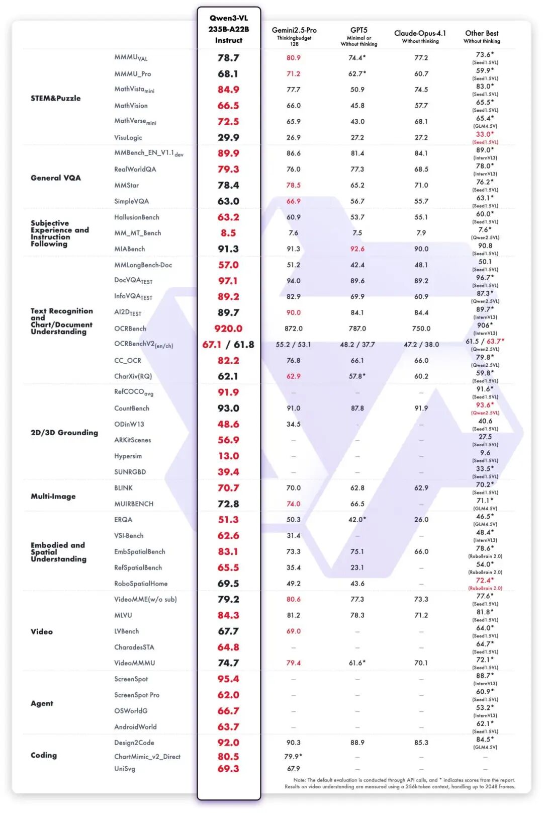 Qwen3-VL具有多维度全面跃升的能力。它在纯文本、视觉感知与推理、上下文支持、空间关系理解、动态视频理解等方面表现出色,在多项视觉感知评测中达到甚至超过Gemini 2.5 Pro等闭源模型。亮点:视觉智能体、视觉Coding能力、空间感知能力、长上下文支持和长视频理解、多模态思考能力等