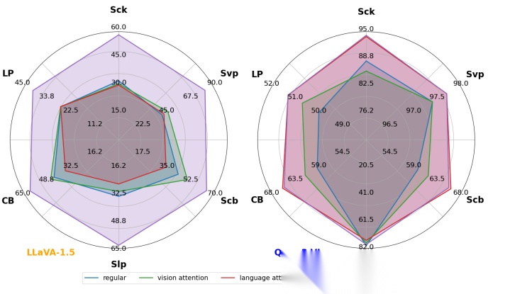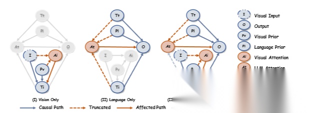 通过进行这些干预,我们可以观察视觉和语言注意力对模型输出的独立贡献,控制混杂因素,例如图像 I、标记 T 和模型的中间表示 Pand P。