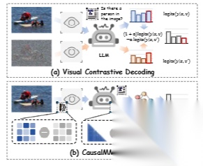 视觉编码器的参数知识(即视觉先验)通过影响视觉编码器的注意力来影响多模态信息的对齐(Tong et al., 2024a;同样,LLM 参数中嵌入的知识(称为语言先验)可能会损害模型通过注意力对多模态输入的保真度(Lee 等人,2024 年)。这些偏见源于视觉编码器和 MLLM 对语言先验的过度依赖,可能会导致多模态幻觉等问题,最终降低模型性能(Yang 等人,2023 年)。已经提出了几种方法来增强模型输出而不修改模型权重(Leng et al., 2024;黄等人,2024 年;Zou 等人,2024a)。然而,如图 1(a)所示,现有的解码策略主要依靠统计相关性和后验分析的预定结论来优化输出,而没有系统地研究视觉注意力、语言注意力、模态先验和模型输出之间的因果关系。在这种情况下,注意力机制仅根据参数知识来调整权重,这限制了模型在推理过程中理解潜在依赖关系的能力,加剧了偏差,导致多模态幻觉等问题。