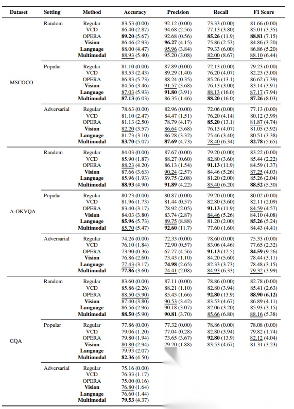 表 1:POPE 任务的主要结果。在不同的解码设置下,我们使用 LLaVa-1.5 评估了 MSCOCO、A-OKVQA 和 GQA 数据集上各种 MLLM 的 POPE 任务精度。常规是指应用直接采样的场景。视觉、语言和多模态是指 CMM 的纯视觉、纯语言和多模态协作变体。粗体和下划线分别指每个设置下的最高和第二高指标。每个值后跟相对于常规设置的差异。