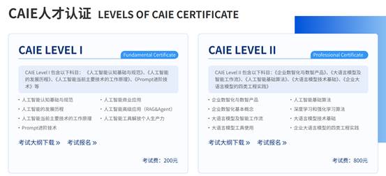 CAIE(注册人工智能工程师)是人工智能领域的技能等级认证,分为两个难度级别,适合不同基础的学习者。