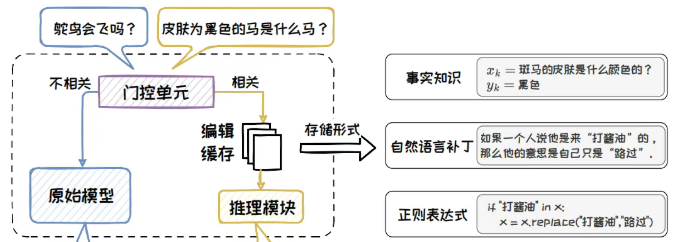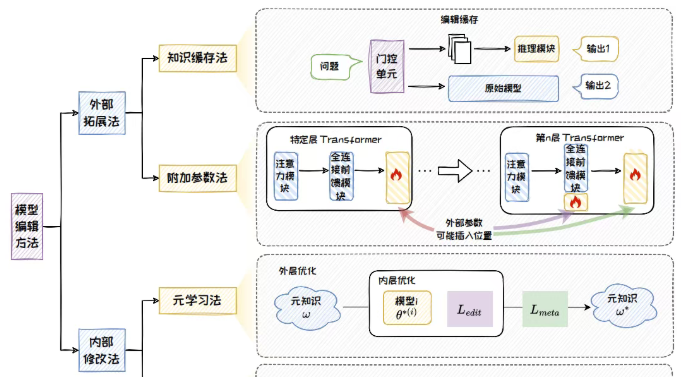 如图所示,外部拓展法主要包括知识缓存法和附加参数法;内部修改法则包括元学习法和定位编辑法。