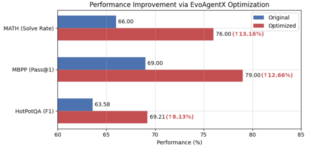 优化前后的性能对比显示,EvoAgentX在三类任务中均实现稳定提升:多跳问答准确率提升9%,代码生成通过率提升13%,数学推理正确率提升8%。这一结果不仅证明自进化机制具备跨场景适应性,更体现框架在构建「可持续优化」多智能体系统上的核心价值。