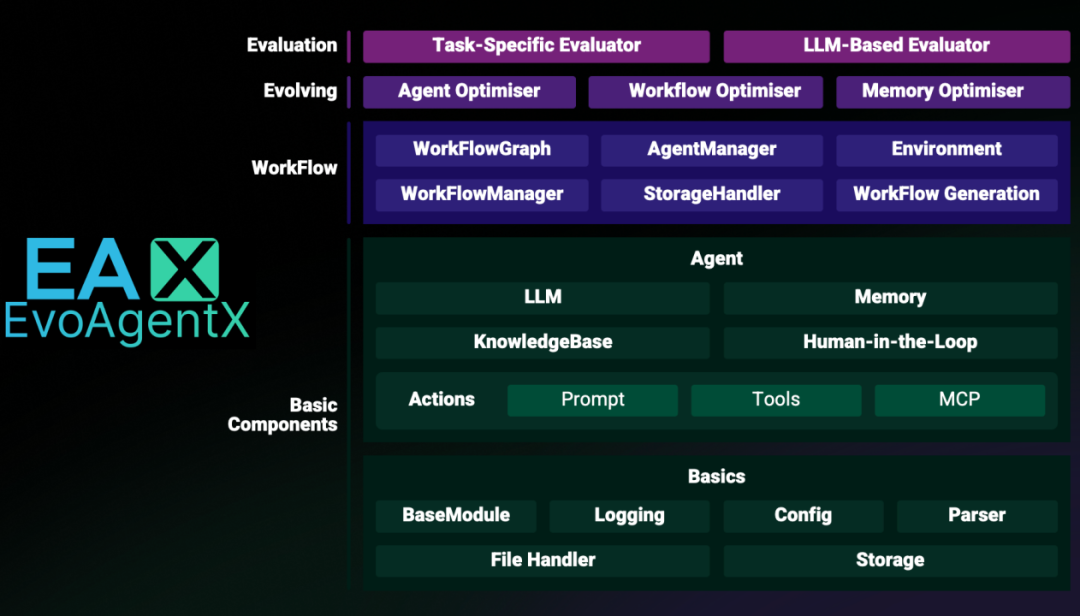 为支撑智能体的自进化能力,EvoAgentX采用模块化分层架构,覆盖从底层基础能力到上层进化功能的全链路,确保系统的灵活性、可扩展性与稳定性。