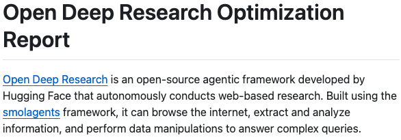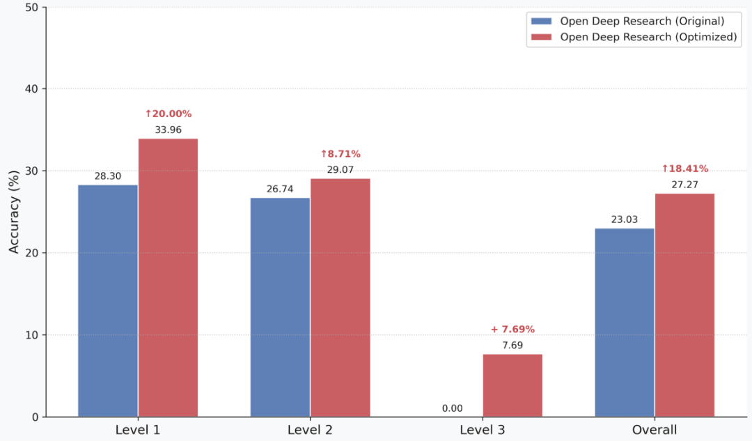 为验证框架对现有系统的兼容性与优化能力,研发团队以GAIA基准测试中的开源多智能体框架「Open Deep Research」(由Huggingface团队开发,支持实时网络搜索回答问题)为对象,基于其原始系统结构,通过EvoAgentX自动优化提示词策略。