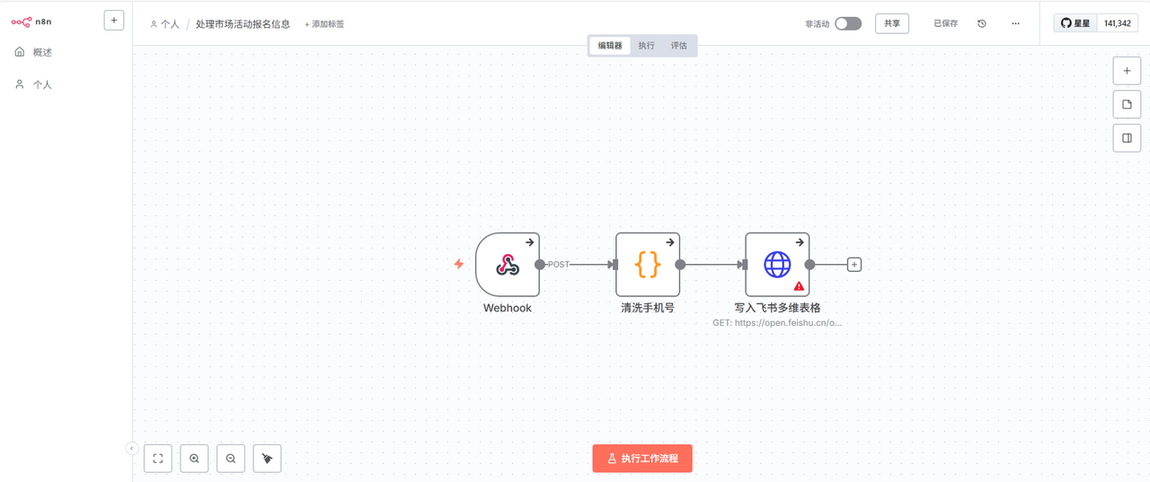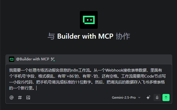 我的指令: “我需要一个处理市场活动报名信息的n8n工作流。从一个Webhook接收表单数据,里面有个'手机号'字段,格式很乱,有带'+86'的,有带'-'的,还有空格。工作流需要用Code节点写一小段JS代码,把手机号清洗成标准的11位数字。然后,把清洗后的数据存入飞书多维表格的一个新行里。”