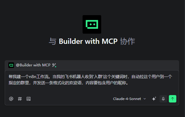我的指令: “帮我建一个n8n工作流。当我的飞书机器人收到'入群'这个关键词时,自动拉这个用户到一个指定的群里,并发送一条格式化的欢迎语,内容要包含用户的昵称。”